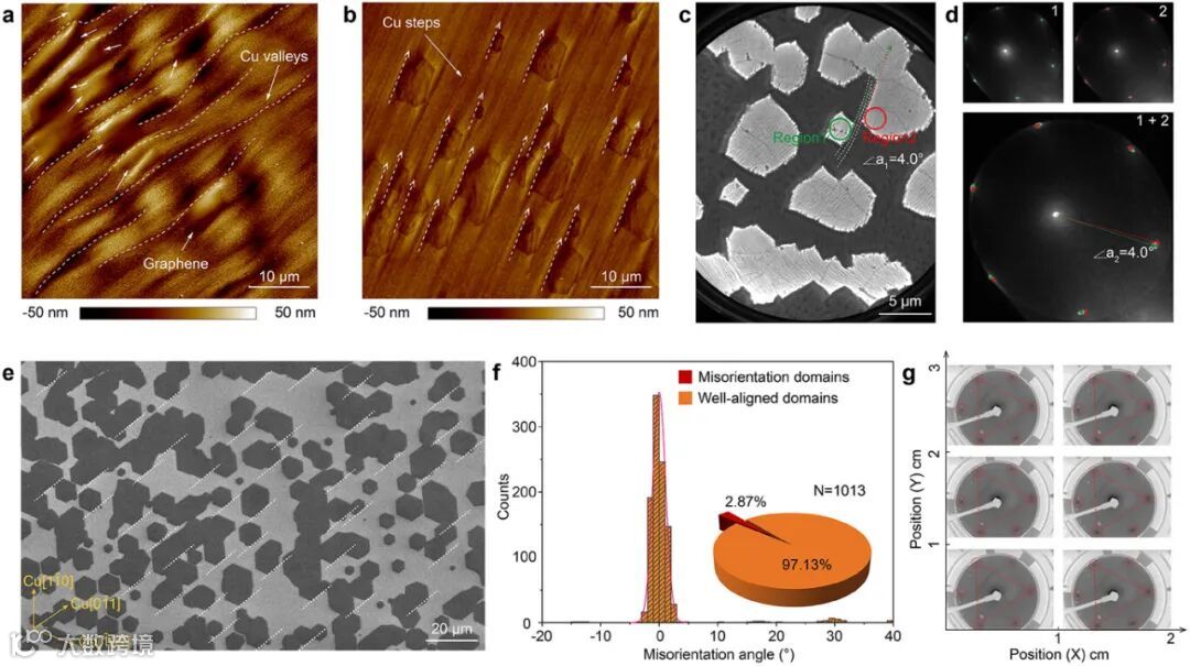 AGG铜箔:冷轧遗留的蜿蜒台阶诱导石墨烯非定向生长,μ-LEED检测相邻晶畴取向偏差达4.0°。