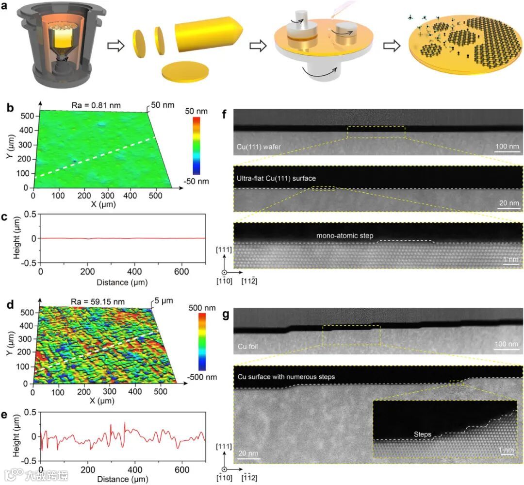 在二维材料(如石墨烯、hBN)的异质外延生长中,原子级平整的单晶衬底是保障材料质量的核心。其中,Cu(111)晶圆因与石墨烯晶格高度匹配,被视为理想衬底。然而,现有制备技术面临两大瓶颈: