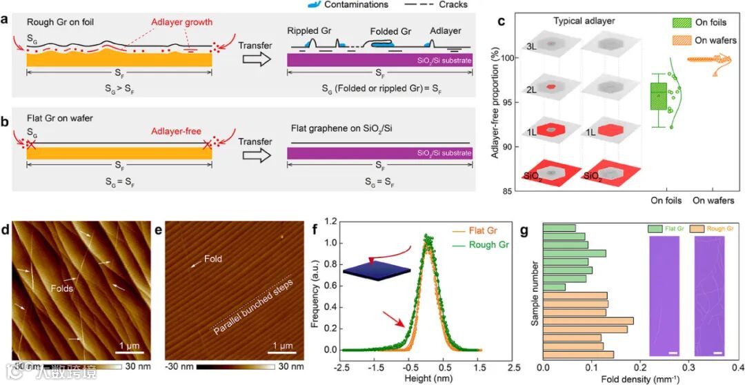 转移褶皱控制:表面曲率半径>10 μm,确保石墨烯/衬底共形接触,转移至SiO₂/Si后褶皱密度降低92%(图5g)。