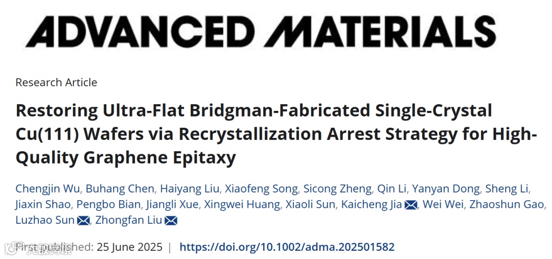 Chengjin Wu, Buhang Chen, Haiyang Liu, et al. Restoring Ultra‐Flat Bridgman‐Fabricated Single‐rystal Cu(111) Wafers via Recrystallization Arrest Strategy for High‐Quality Graphene Epitaxy. Advanced Materials, 2025, DOI: 10.1002/adma.202501582.