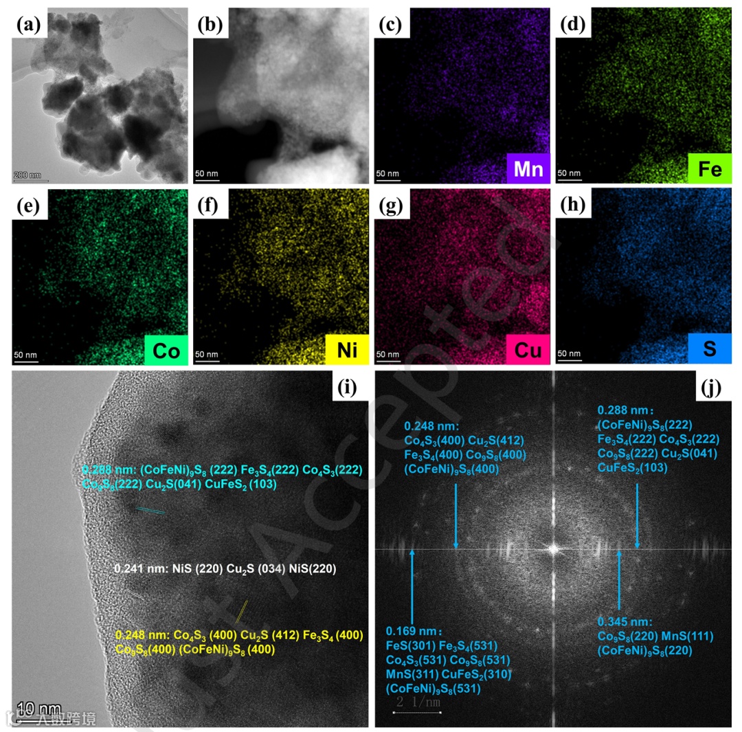 图2 微观结构与元素分布:TEM与EDS分析证实Mn、Fe、Co、Ni、Cu五种元素均匀分布,HRTEM显示多种硫化物纳米晶嵌于非晶基质中的复杂结构。