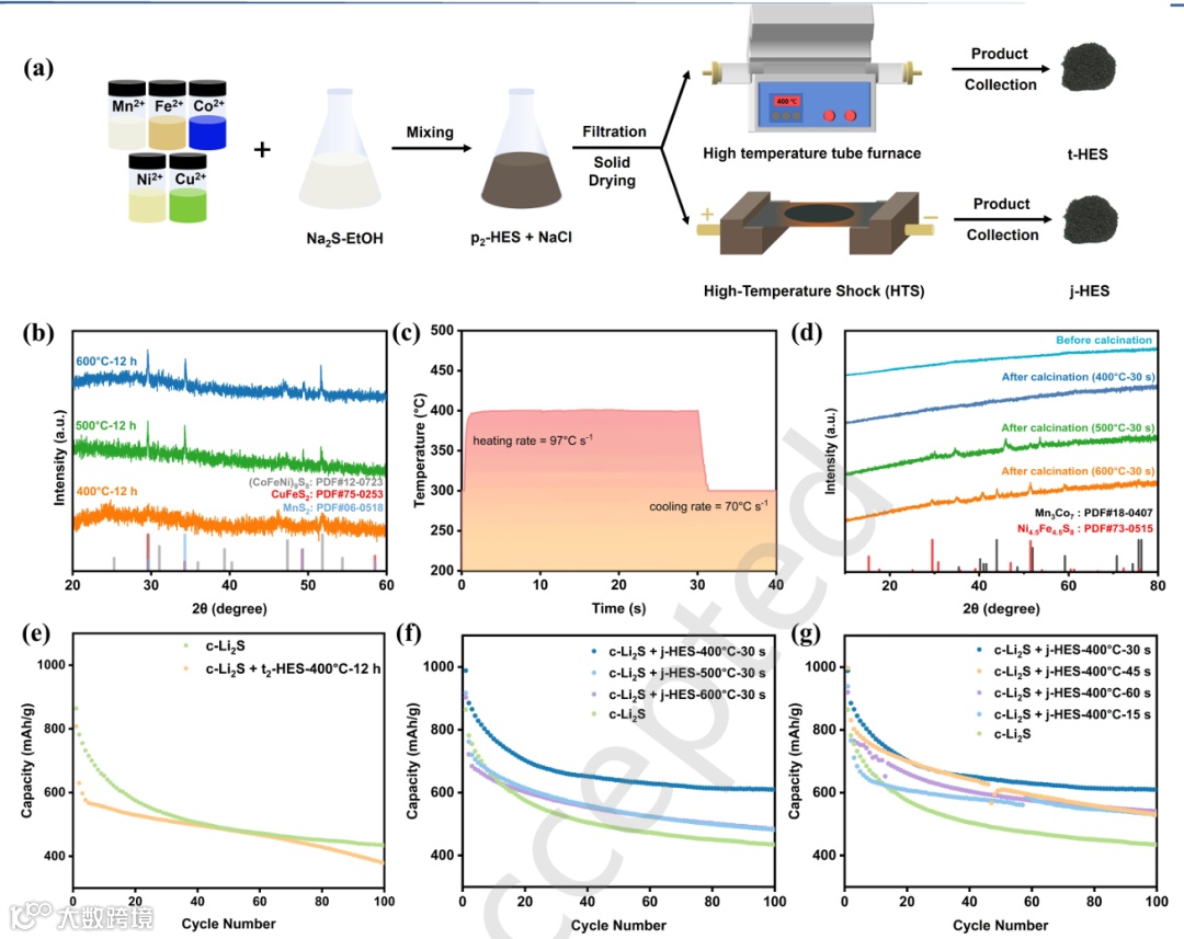 图1 合成路径与性能对比:对比传统管式炉烧结与焦耳加热合成,发现j-HES-400°C-30s样品呈现非晶态特征,且电化学性能最优,初始容量达989 mAh g⁻¹,100次循环后容量保持率62%。