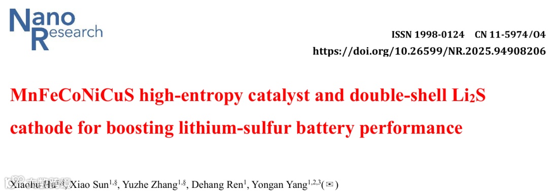 锂硫电池商业化受限于Li₂S正极的动力学迟滞与穿梭效应。天津大学杨永安教授团队在《Nano Research》上发表创新研究成果。团队采用高温冲击焦耳加热技术,在400°C、仅30秒内成功制备出五元高熵硫化物催化剂(MnFeCoNiCuS),并结合双壳层Li₂S正极设计,构建出高性能复合电极。该电极在0.5C倍率下循环100周后容量保持609 mAh g⁻¹,在2C高倍率下容量达562 mAh g⁻¹,性能较传统正极提升超40%,为锂硫电池的电极设计提供了新范式。