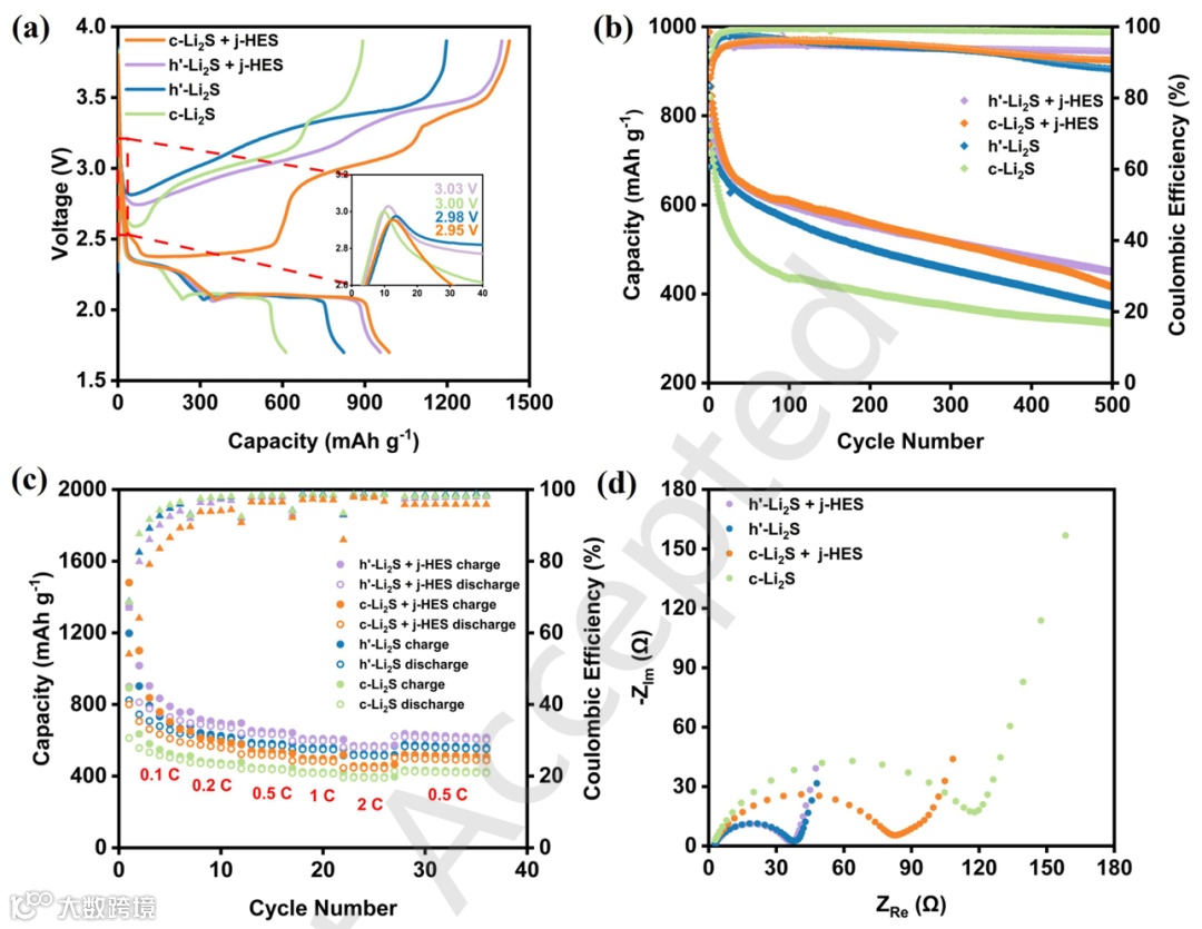 图6 综合电化学性能:复合正极具有最低电荷转移电阻(32 Ω) 和最高锂离子扩散系数(5.27×10⁻¹⁰ cm² s⁻¹),协同作用显著提升电池性能。