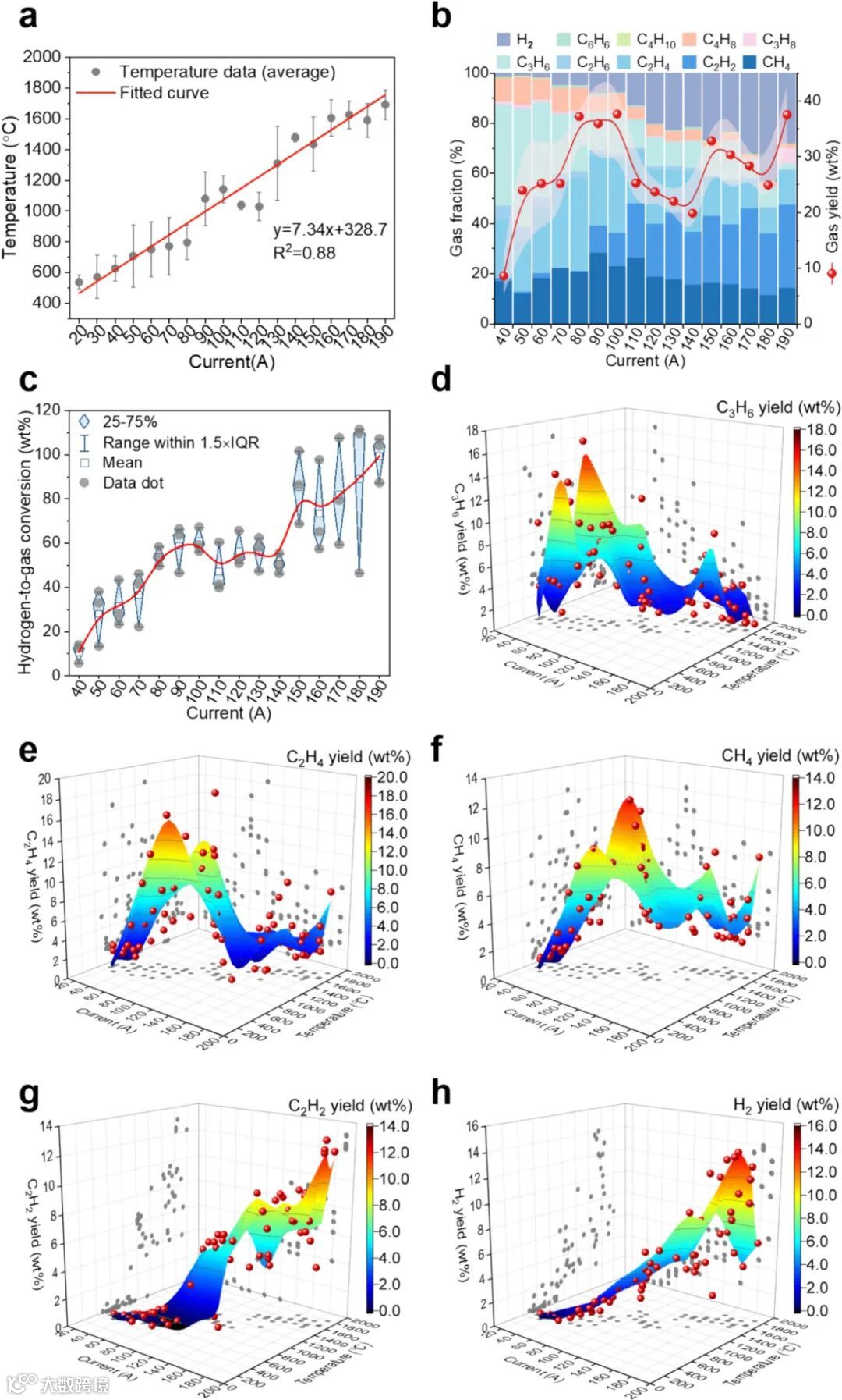 随着电流从40 A增至190 A,气体产率呈现独特的三段式变化。50 A时丙烯产率最高达47.3 wt%,190 A时氢回收率接近完全(99.4%),三维响应曲面揭示不同气体组分的最优电流区间,实现从单体回收到氢气制备的定向转化。