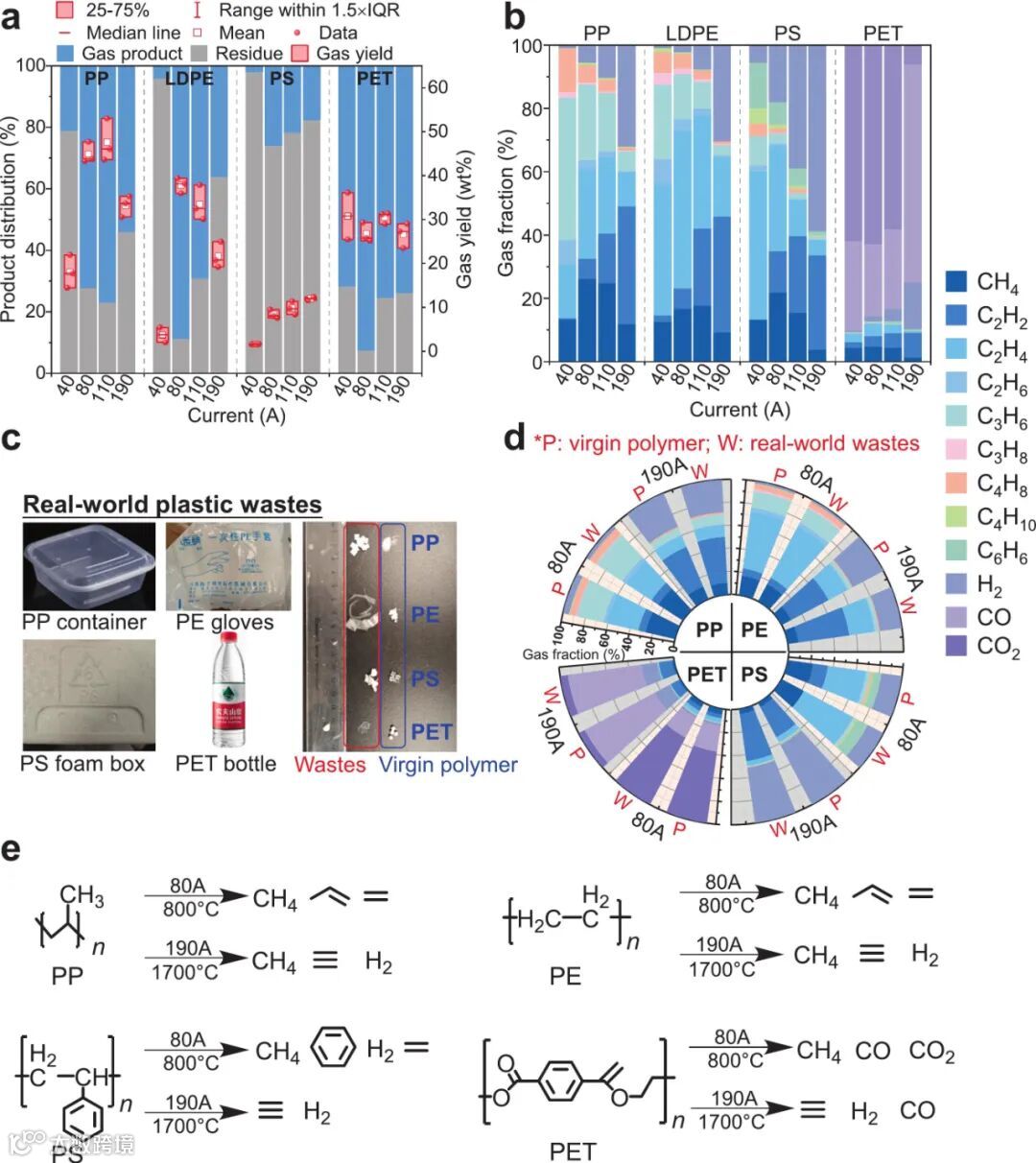 脂肪族聚合物(PP、PE)在中等电流下气体产率最高(40–50 wt%),芳香族聚合物(PS、PET)因H/C比较低生成更多固体残渣。实际废弃塑料与纯聚合物热解行为高度一致,验证技术实际适用性。
