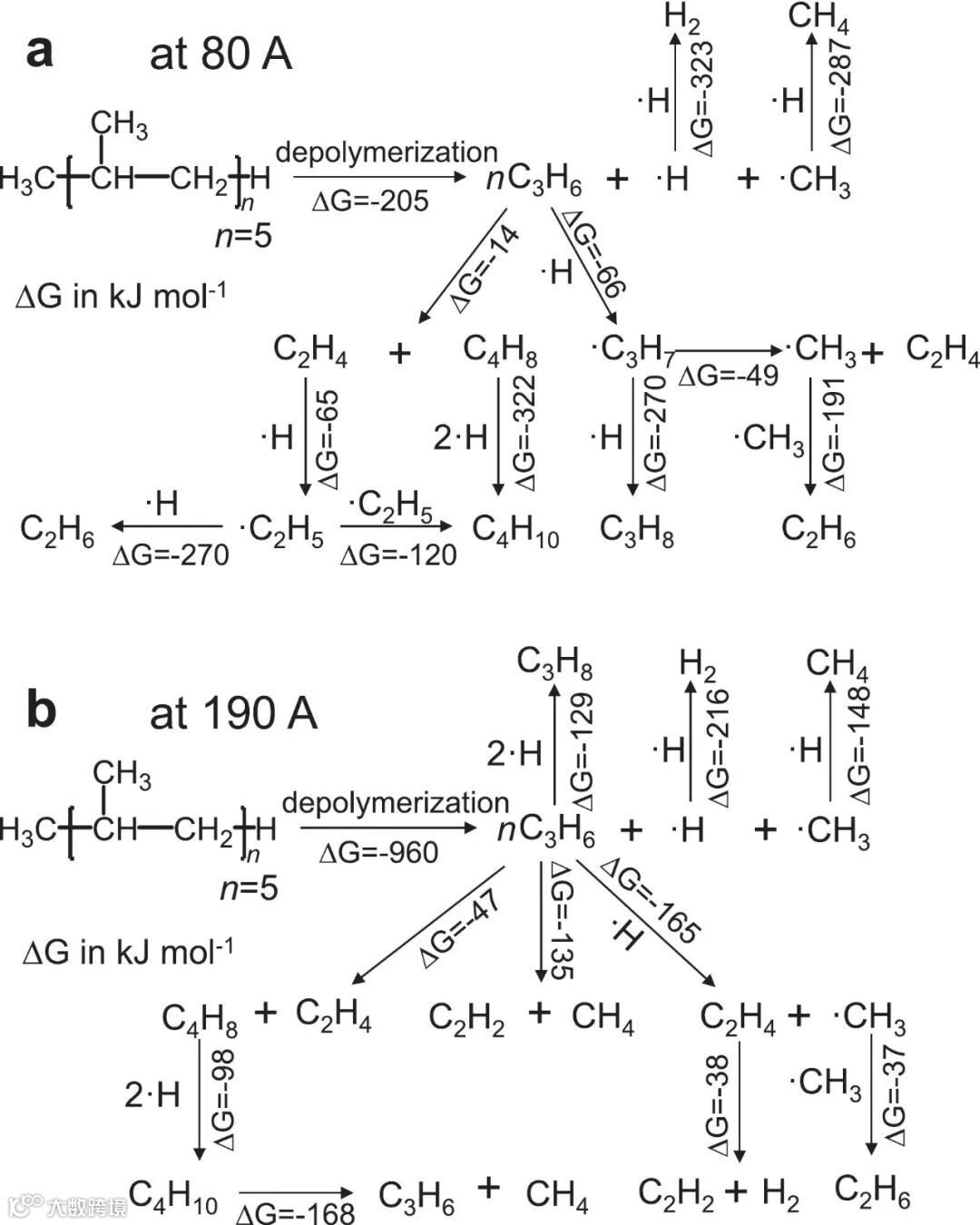 吉布斯自由能计算揭示:80℃(约800°C)条件下PP经历β断裂生成丙烯,190℃(约1700°C)时促进脱氢形成乙炔与氢气。相关性分析显示甲烷与乙烯、氢气与乙炔呈强正相关,为理解转化机制提供理论依据。