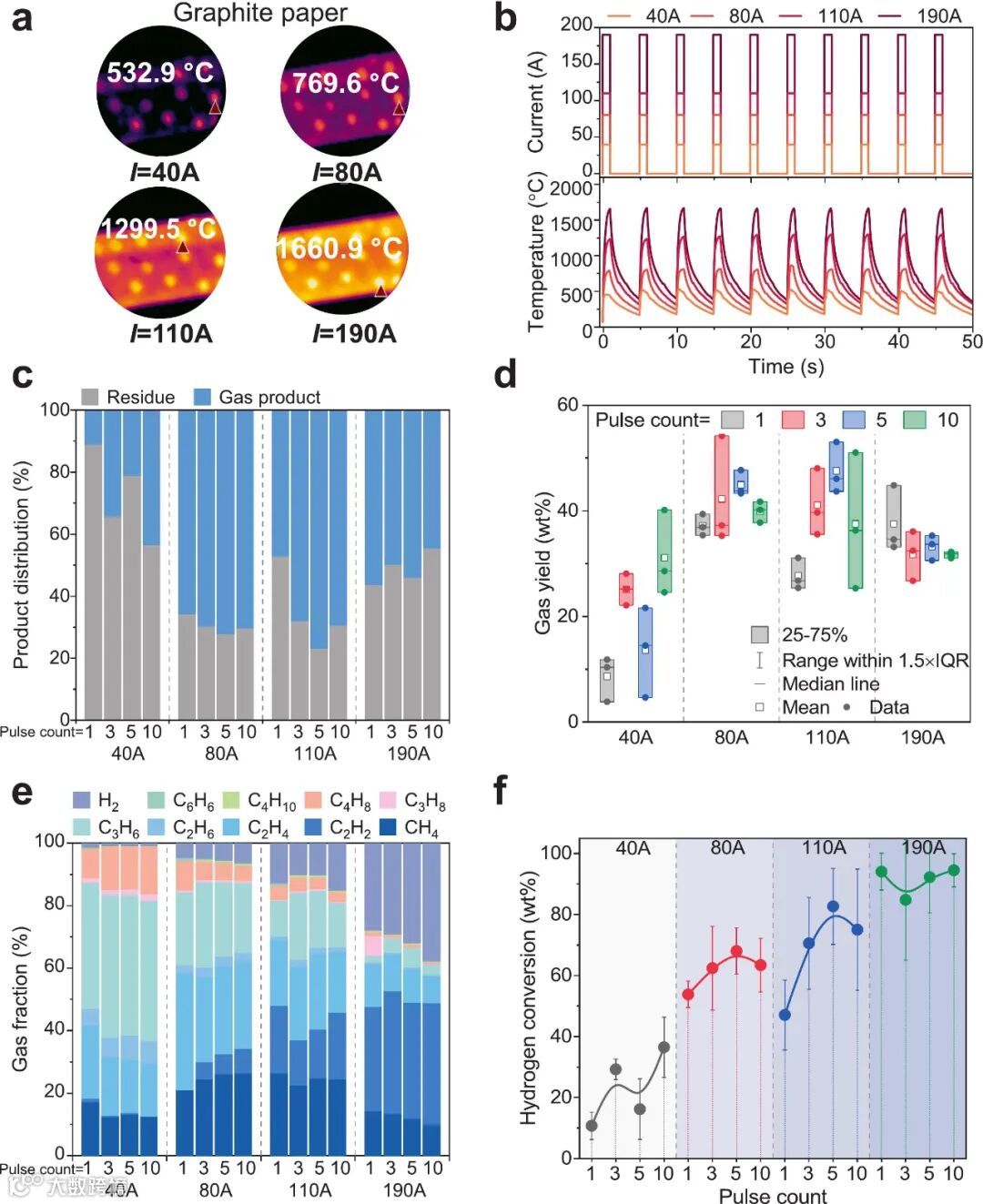 系统在连续10次脉冲后温度波动小于4°C,展现卓越热稳定性。40 A条件下提高脉冲次数提升气体产率,190 A时单次脉冲即实现完全分解,多次脉冲促进氢气与乙炔生成(占比61.2–76.6%),证实脉冲策略对反应路径的有效调控。