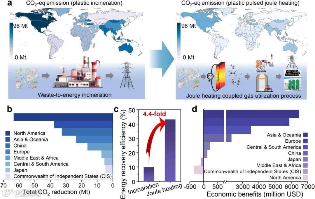 替代全球30%废塑料焚烧,年减排1.9亿吨CO₂当量,降幅66.6%。能源回收效率提升至43.2%,为焚烧的4.4倍。多数地区因高值气体回收获正向收益,全球年经济收益达181亿美元。