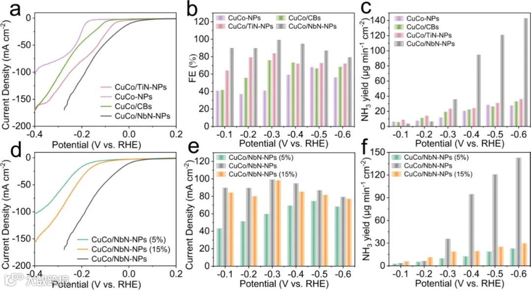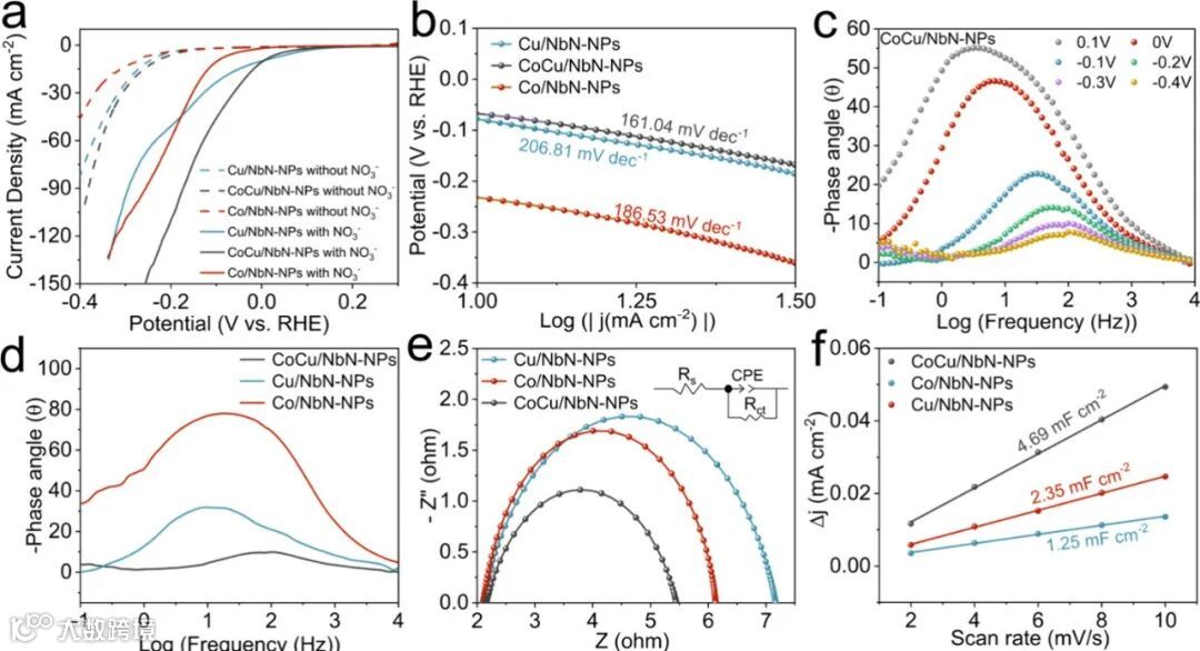 线性扫描伏安曲线显示,CoCu/NbN在含有硝酸根的电解液中,起始电位明显正移,电流密度大幅提升。其Tafel斜率低至161.04 mV·dec⁻¹,显著低于单金属催化剂,表明其具备更快的本征反应动力学。电化学阻抗谱进一步支持了这一结论,CoCu/NbN表现出最小的电荷转移电阻和最大的双电层电容,说明其拥有更高效的电荷传输界面和更丰富的电化学活性位点。
