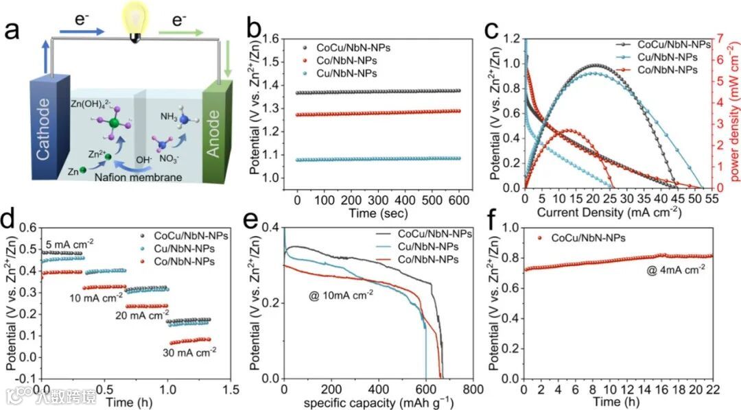 为展示其实际应用潜力,研究将CoCu/NbN作为正极催化剂,组装了液态锌-硝酸盐电池。该器件展现出1.37 V的开路电压和5.75 mW·cm⁻²的峰值功率密度。在放电测试中,其质量比容量高达672 mAh·g⁻¹,且性能优于基于单金属催化剂的对照电池。这项工作成功地将基础催化剂的优异性能转化为实际器件的输出,演示了将硝酸盐污染物转化为电能与高价值氨产品的完整技术路径。
