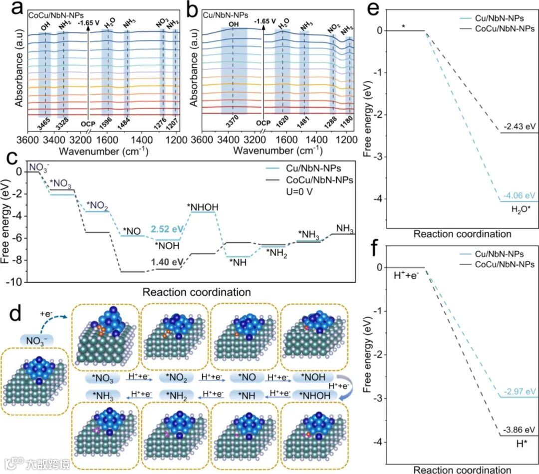 本研究通过原位傅里叶变换红外光谱和密度泛函理论计算,从分子和原子层面揭示了催化机理。原位FTIR动态监测到了NO₂、NH₂等关键中间体的生成与消耗,并发现CoCu/NbN上NO₂信号的衰减速率更快,暗示其加氢步骤被加速。DFT计算定量阐明:在CoCu/NbN的界面活性位点上,决速步(NOH → *NHOH)的能垒仅为1.40 eV,远低于在Cu/NbN上的2.52 eV。计算还表明,界面处增强了H₂O和H*的吸附,这协同促进了加氢过程并有效抑制了竞争性的析氢副反应。
