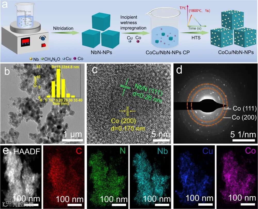 本图清晰展示了CoCu/NbN催化剂的合成路径及其均质的微观结构。示意图表明,高温热冲击法通过瞬时高电流脉冲,使前驱体在氮气氛中经历“闪蒸-淬火”过程。TEM图像证实,合成的CoCu合金纳米颗粒在NbN载体上高度分散,平均粒径仅为18.3 nm。高分辨TEM显示的清晰晶格条纹与选区电子衍射图谱,共同证实了合金的面心立方单相结构。最为直观的是,EDS元素面分布图显示钴(Co)与铜(Cu)信号在纳米颗粒内完全重叠,实现了原子级别的均匀混合,无可辩驳地证明了HTS技术对抑制元素偏析、构筑均质合金的强大能力。