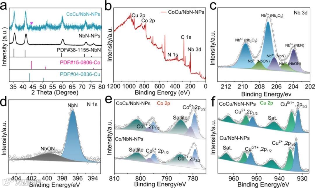 通过X射线衍射与X射线光电子能谱,本研究深入揭示了催化剂的体相结构与表面化学环境。XRD图谱中出现的特征峰,确认了CoCu合金的形成且无杂相。XPS结果则提供了更深层的电子相互作用证据:与单金属对照相比,CoCu/NbN中Co 2p₃/₂的结合能升高,而Cu 2p₃/₂的结合能降低。这直接表明,在界面处存在从Co到Cu的显著电子转移。这种由NbN载体介导的电子重排,优化了催化剂表面的电子结构,为高效吸附和转化反应中间体奠定了基础。