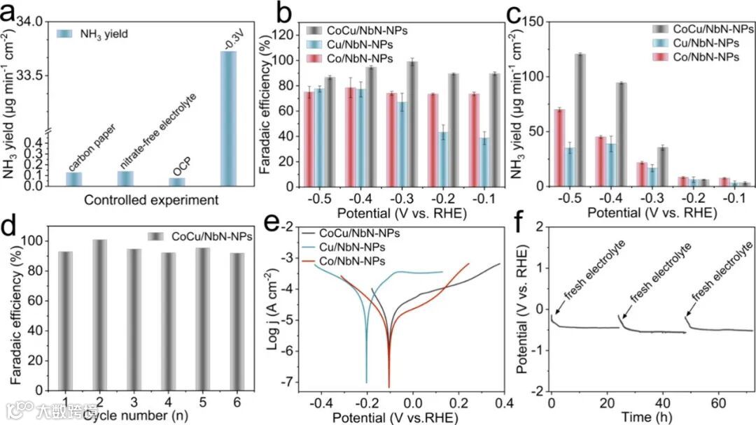 本图展示了催化剂的综合性能指标。在优化的-0.3 V电位下,CoCu/NbN实现了35.5 μg·min⁻¹·cm⁻²的高氨产率,同时法拉第效率接近理论极限的100%,性能全面超越单组份催化剂。在长达300小时的恒电位电解测试中,产氨性能未见衰减。通过电感耦合等离子体发射光谱对电解液进行分析,检测到Co、Cu离子的溶出率极低(<0.1%),从化学角度证实了催化剂卓越的结构稳定性与抗溶出能力。