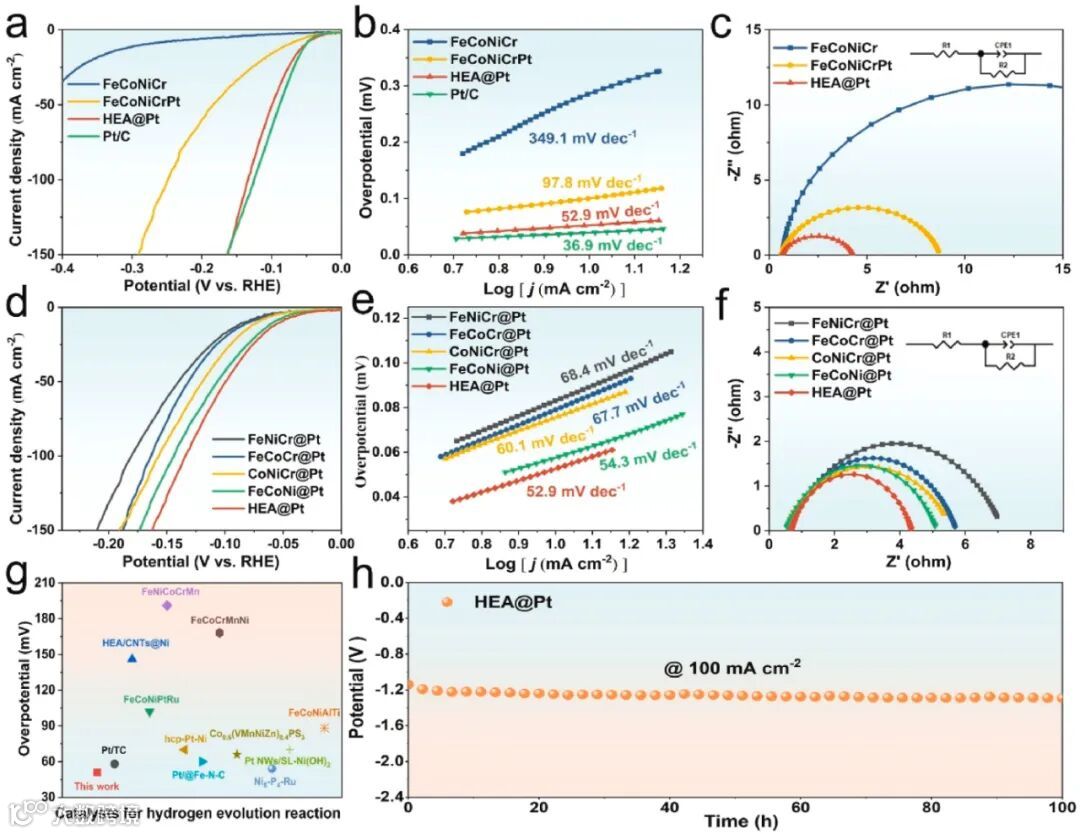 图4 的电化学性能测试显示,HEA@Pt的活性、动力学及稳定性均显著优于对照样品,在100 mA cm⁻²下运行100小时后过电位仅增加8.3%。