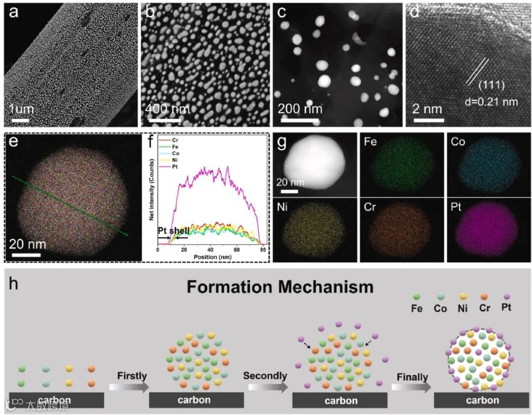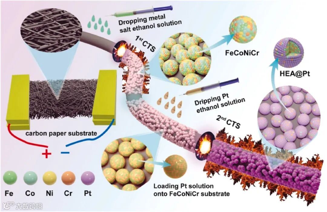 图1 展示了两步碳热冲击法的合成流程:首次冲击(1秒)形成FeCoNiCr四元合金前驱体,二次冲击(0.5秒)引入Pt并形成核壳结构,差异化时间控制是实现Pt表面偏析的关键。