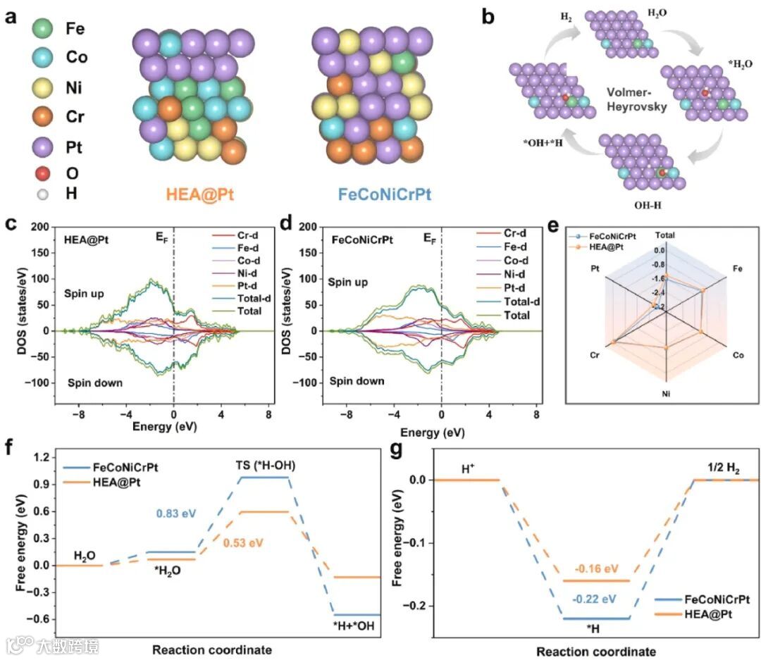图5 的DFT计算揭示,HEA@Pt的d带中心(-1.424 eV)更靠近费米能级,其水分子解离能垒(0.52 eV)与氢吸附自由能(-0.16 eV)均得到优化,从理论上阐明了高性能根源。