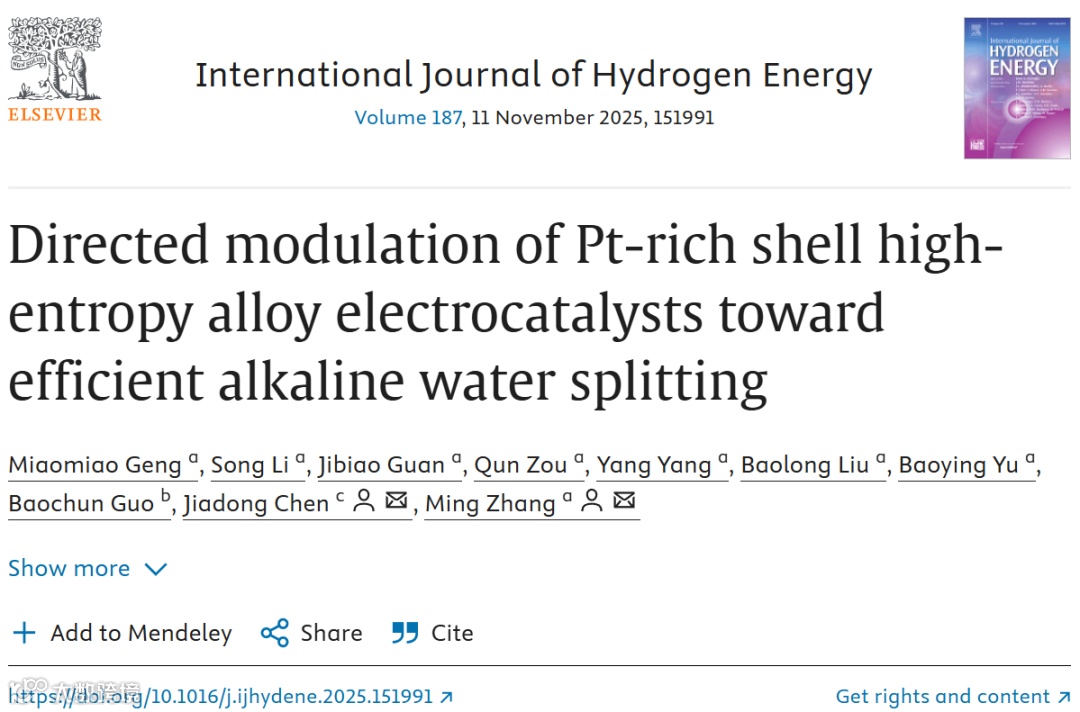 开发兼具高活性与高稳定性的低铂催化剂是推动电解水制氢产业化的关键挑战。近日,浙江理工大学张明教授团队在《International Journal of Hydrogen Energy》上发表重要研究成果。团队创新性地采用两步碳热冲击法,成功构建了具有铂富集壳层的高熵合金核壳结构催化剂(HEA@Pt)。该催化剂在碱性析氢反应中表现出卓越的性能,仅需51 mV的过电位即可达到10 mA cm⁻²的电流密度,并在100 mA cm⁻²下稳定运行超过100小时。该研究为设计高性能、低成本的高熵合金电催化剂提供了新思路。