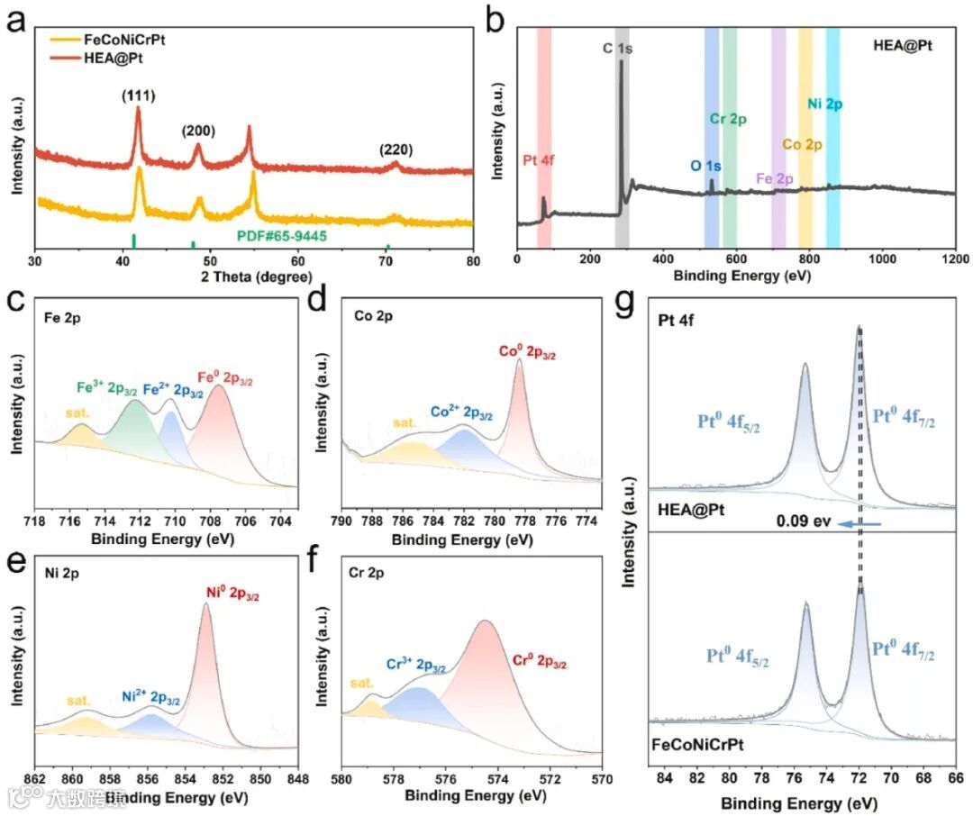 图3 的结构表征表明,材料为单一面心立方固溶体,XPS中Pt 4f结合能的正移(+0.09 eV)证实了核壳间的强电子相互作用。