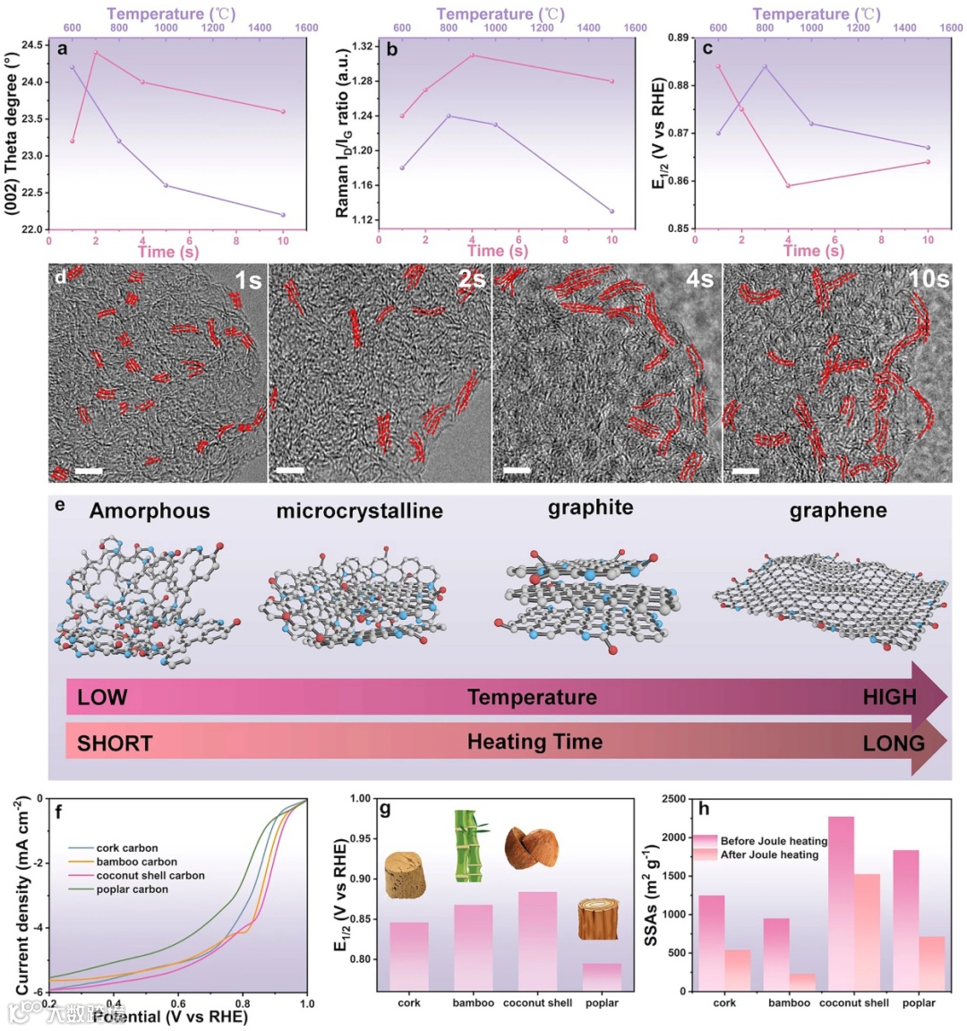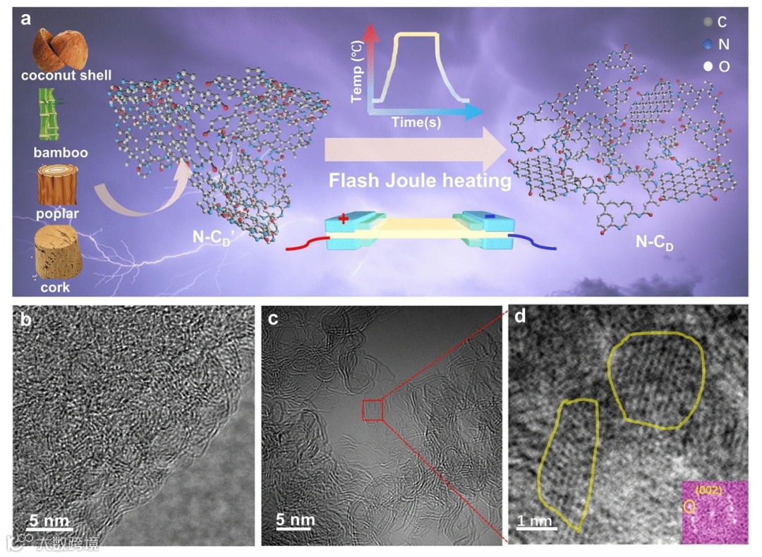 用1 秒闪蒸焦耳热处理,让生物质碳材料的 sp²-C 域含量飙升,石墨化程度提升 40%(相当于给碳材料 “搭起高速导电网”) - 性能碾压