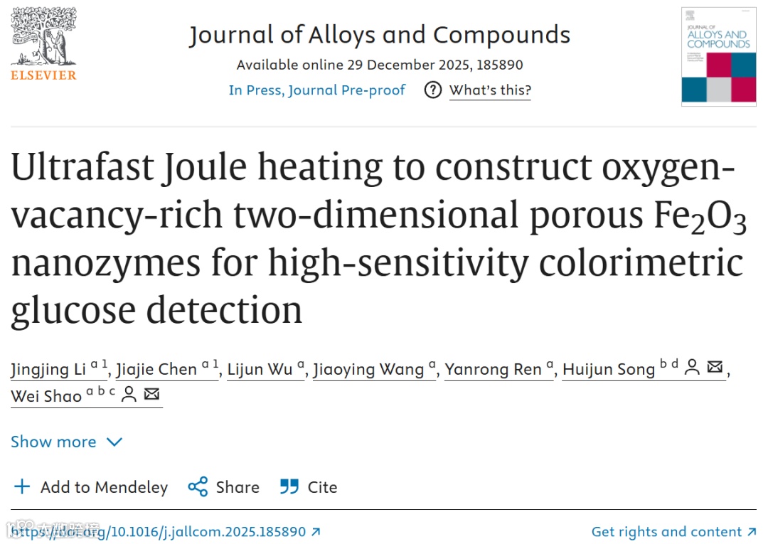 Jingjing Li, Jiajie Chen, Lijun Wu, Jiaoying Wang, Yanrong Ren, Huijun Song, Wei Shao*. Ultrafast Joule heating to construct oxygen-vacancy-rich two-dimensional porous Fe2O3 nanozymes for high-sensitivity colorimetric glucose detection. J. Alloys Compd. 2025.