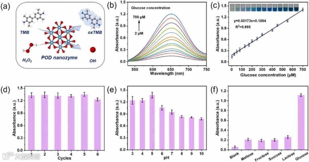 性能突出:材料展现出卓越的类过氧化物酶活性,基于其构建的比色传感体系对葡萄糖的检出限低至1.56 μM,线性范围宽(2–700 μM)。
