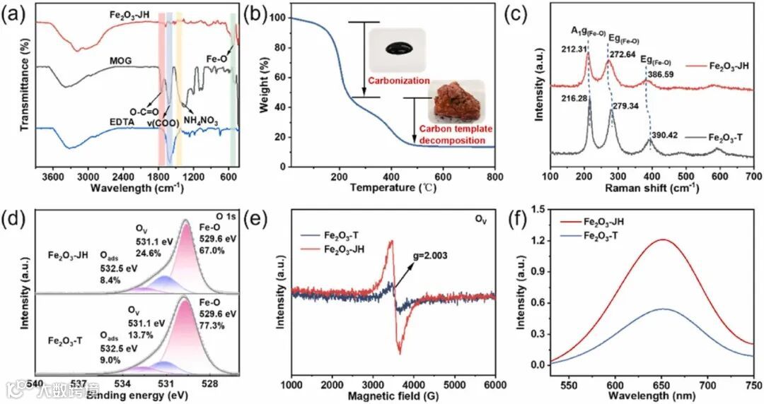 结构优异:成功构建兼具二维多孔形貌与高密度缺陷(氧空位浓度24.6%)的Fe₂O₃,有利于底物传质与电子转移。