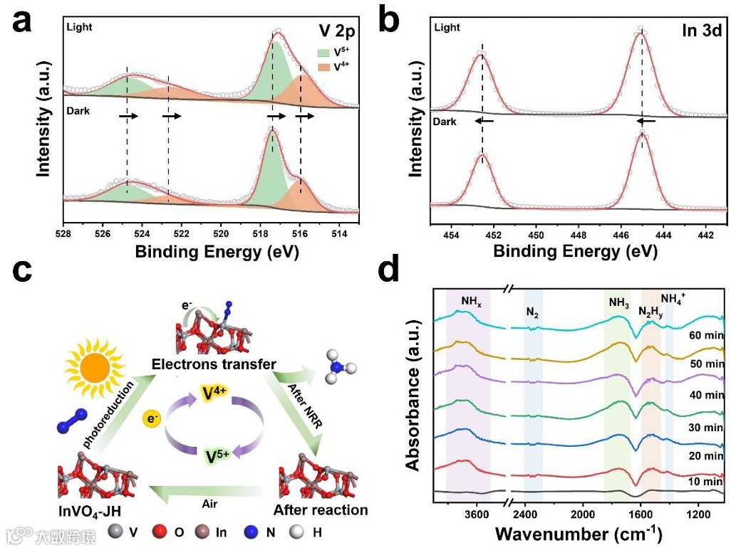 原位XPS监测到在光照条件下,催化剂表面的V⁴⁺比例进一步升高,表明光生电子优先富集于V位点,反应后可恢复,揭示了V⁴⁺/V⁵⁺的可逆氧化还原循环在反应中起关键作用。原位傅里叶变换红外光谱成功检测到氮气加氢过程中多种中间产物的特征信号,为反应路径提供了直接的实验证据。