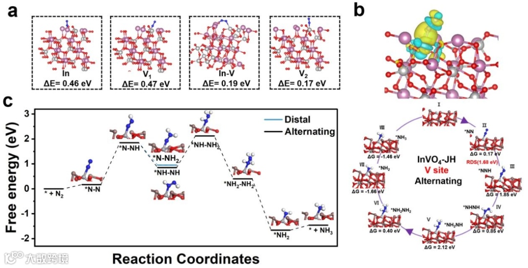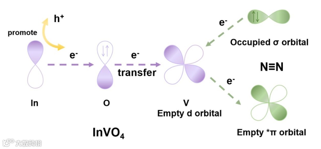 该图从理论上说明了InVO₄作为双金属氧化物在光催化固氮中的潜在优势。In³⁺与V⁵⁺位点通过桥氧原子产生协同作用,这种结构有利于光生电荷的分离与迁移,从而为后续的氮气吸附与活化过程奠定基础。