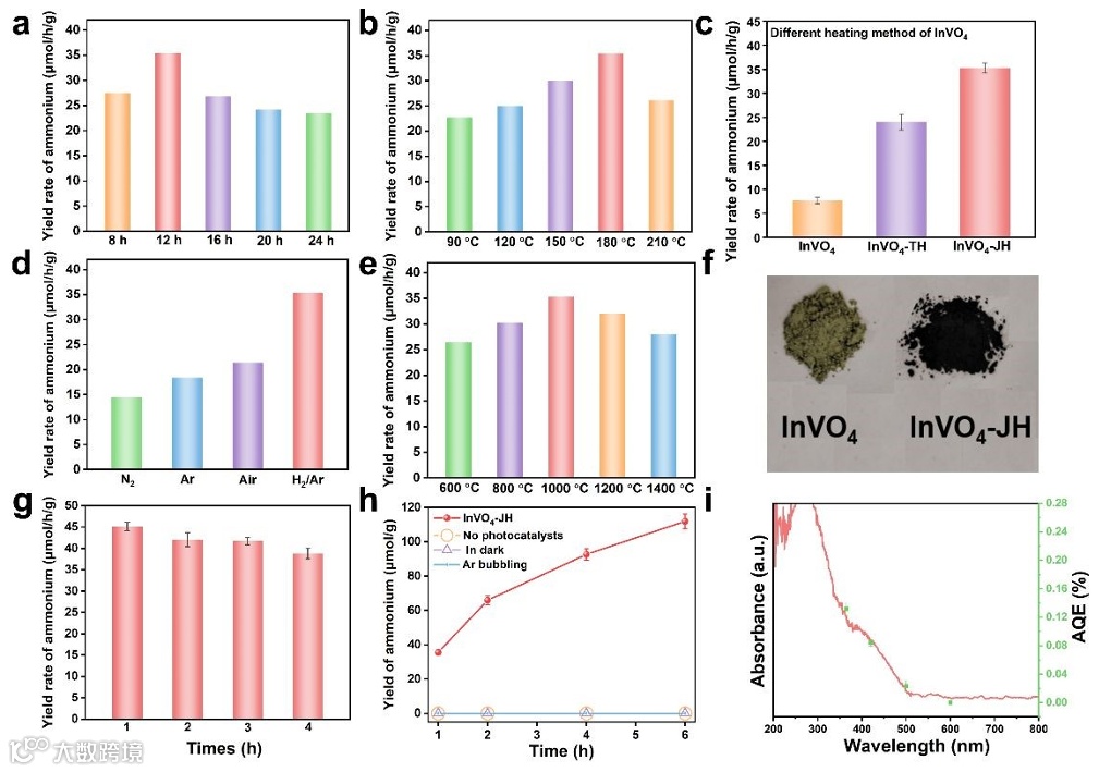系统性的性能测试表明,经过焦耳热优化的样品(InVO₄-JH)其氨产率远高于传统热处理样品。研究详细考察了焦耳加热温度与气氛的影响,确定在1000°C、H₂/Ar气氛下性能最优,产率达到35.28 μmol g⁻¹ h⁻¹。循环测试证明催化剂性能稳定,且氨产量随光照时间线性增长。