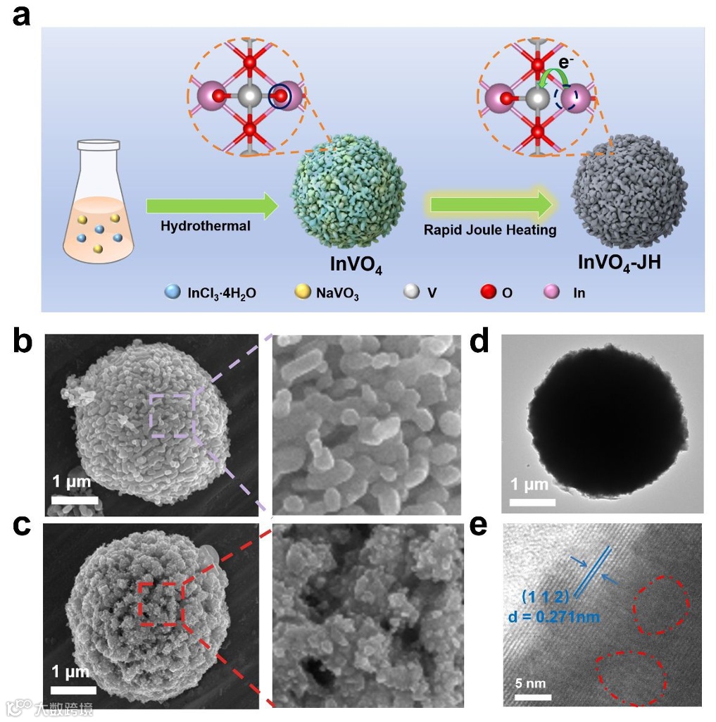 示意图展示了经由水热法合成前驱体,再通过快速焦耳加热处理的制备流程。扫描电镜图像对比鲜明:传统管式炉热处理导致颗粒熔融团聚,而焦耳热处理后的样品仍能保持原始的纳米球状形貌。透射电镜图像进一步显示材料结晶良好,但局部晶格条纹存在畸变,暗示表面缺陷的产生。