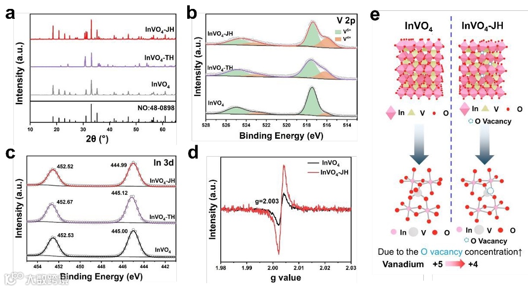 光催化氮还原合成氨被视为替代高能耗哈伯-博世法的绿色途径,但其效率受限于氮气分子的惰性与催化剂活性位点不足。中国海洋大学李子真副教授团队在《Inorganic Chemistry Frontiers》上发表研究,提出了一种“选择性键断裂”策略。该研究基于理论预测,采用快速焦耳加热技术(1000°C) 对钒酸铟(InVO₄)进行瞬态处理,选择性断裂V–O键,从而定向构筑氧空位并暴露配位不饱和的V⁴⁺活性位点。优化后的催化剂(InVO₄-JH)在无任何牺牲剂的条件下,光催化合成氨速率达到 35.28 μmol g⁻¹ h⁻¹,性能提升显著。通过原位表征与理论计算,研究揭示了V⁴⁺位点作为反应中心,有效促进氮气吸附与活化的微观机制。