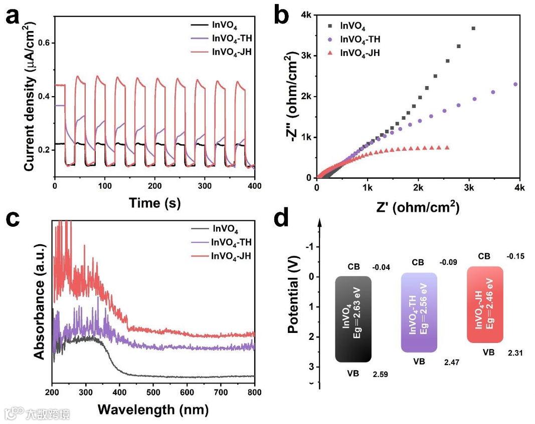 光电性能测试表明,InVO₄-JH具有最强的瞬态光电流响应和最小的电化学阻抗圆弧半径,说明其光生电荷分离效率最高、界面电荷转移阻力最小。紫外-可见漫反射光谱显示其光吸收能力增强。能带结构分析表明,其导带位置更负,热力学上更有利于驱动氮还原反应。