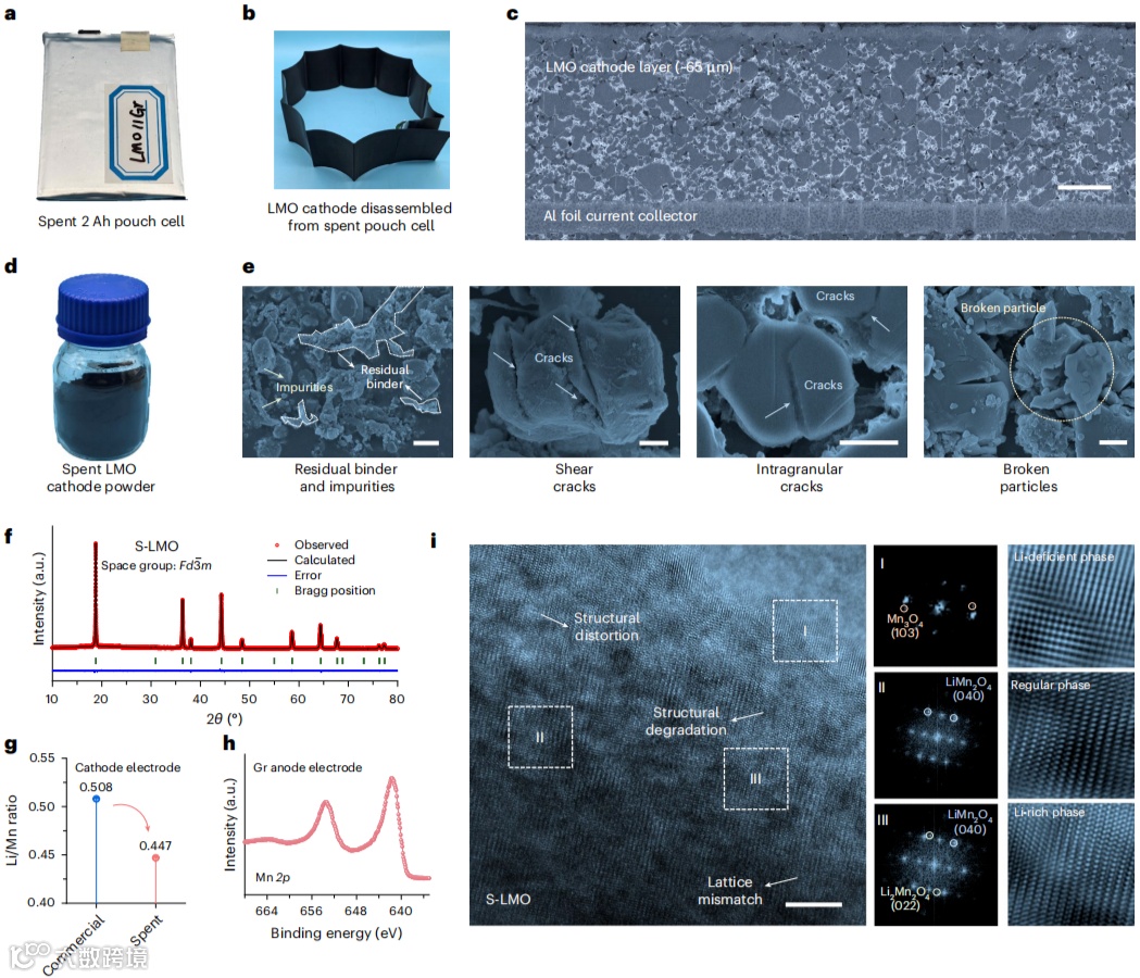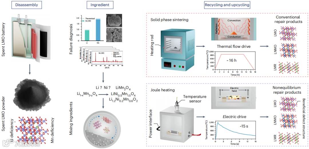 S-LMO 失锂 10.6 %、失 Mn 2.1 %,石墨负极检出 Mn,印证溶解-沉积失效机理。作者给出判定阈值:ΔLi<5 % 选固相,>10 % 选焦耳热快速补锂。