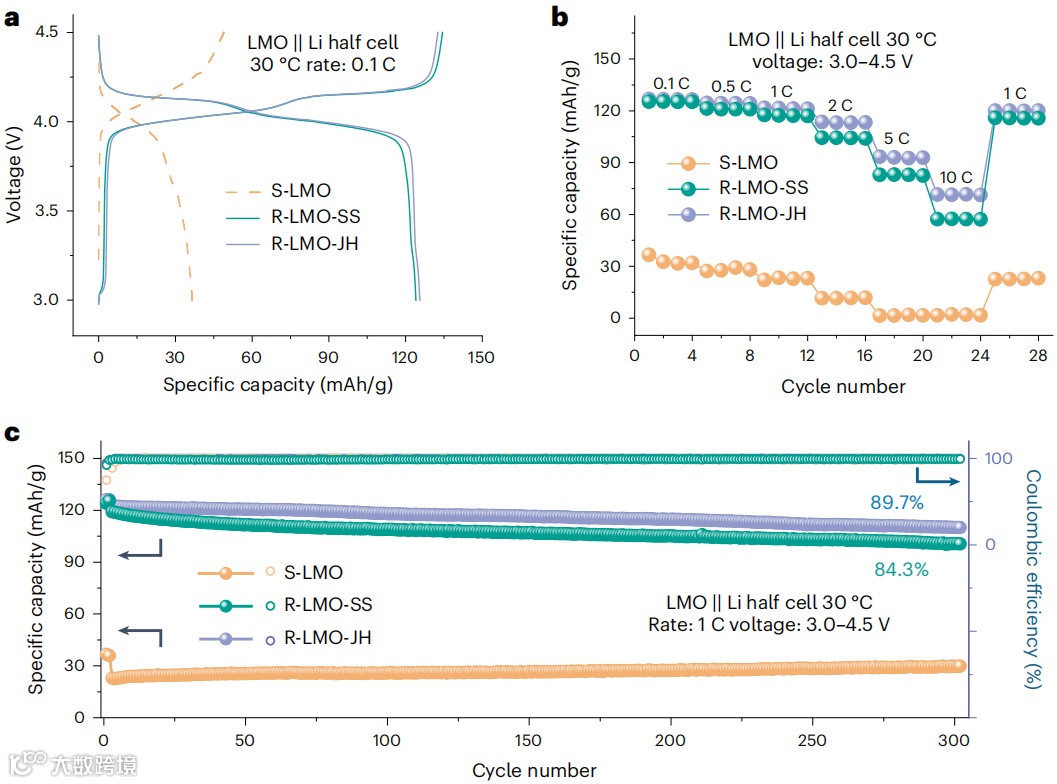 R-LMO-JH 首圈 125.6 mAh g⁻¹,300 圈保持 89.7 %;软包级 300 Wh kg⁻¹ 循环 200 圈无胀气。