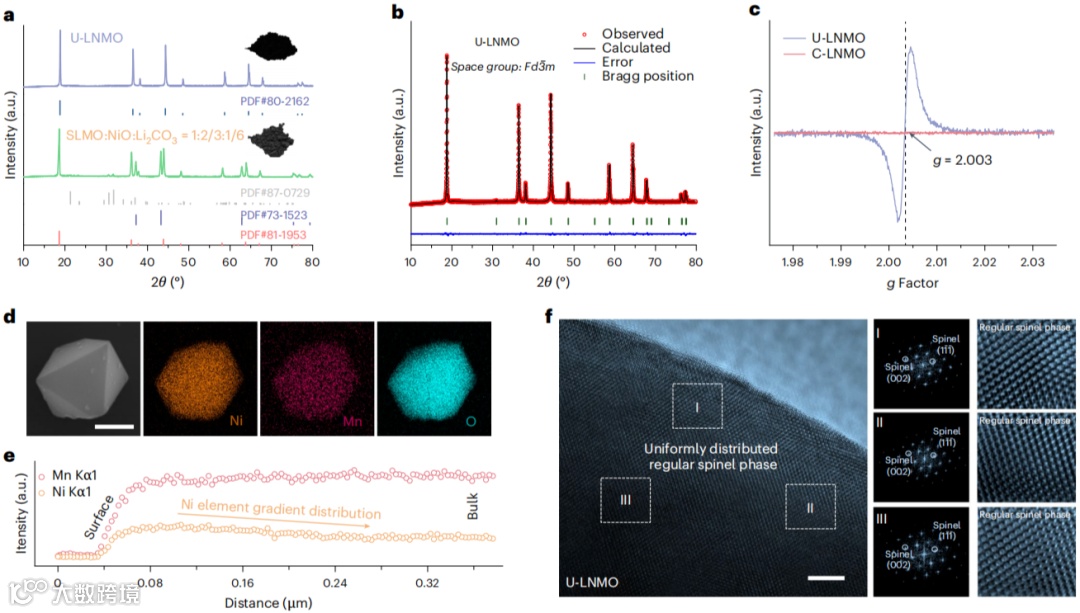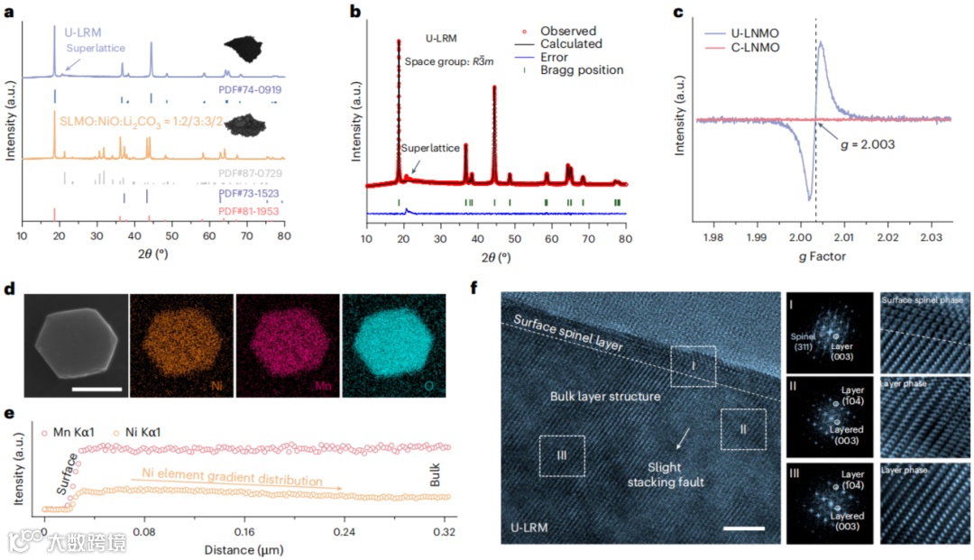 • 结构指纹:XRD 21° 附近出现 Li2MnO3 超晶格峰;HRTEM 显示表层尖晶石-体相层状异质结,氧空位 g=2.003 信号增强,为抑制 O2 释放提供化学锚点。