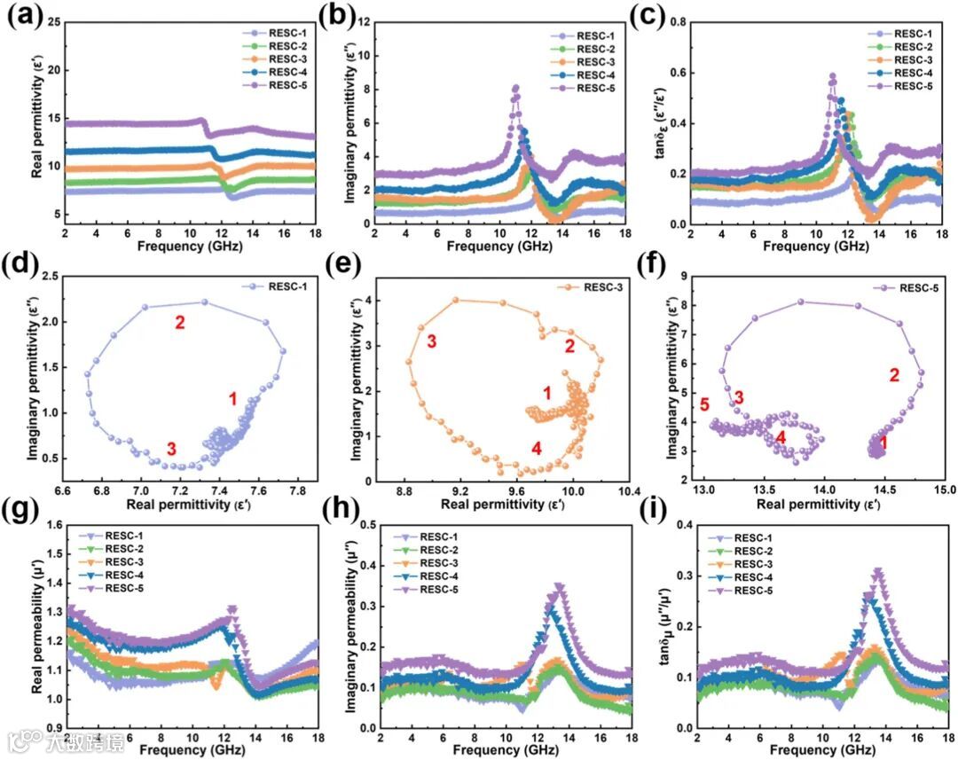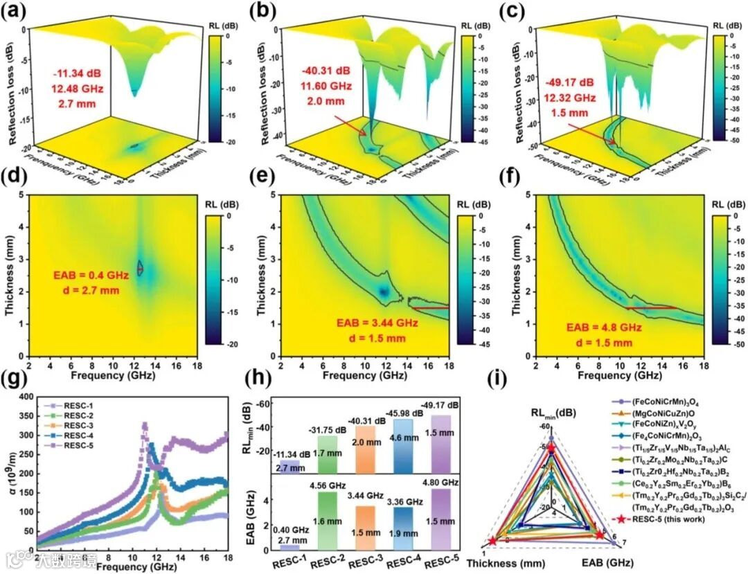 性能数据完美呼应了结构演变。图6 显示,随着熵值增加,材料的复介电常数实部与虚部、介电损耗角正切值均系统性提升。科尔-科尔图中出现更多半圆弧,表明RESC-5具有更丰富的德拜弛豫过程(如界面极化、偶极子转向极化),损耗机制多元化。