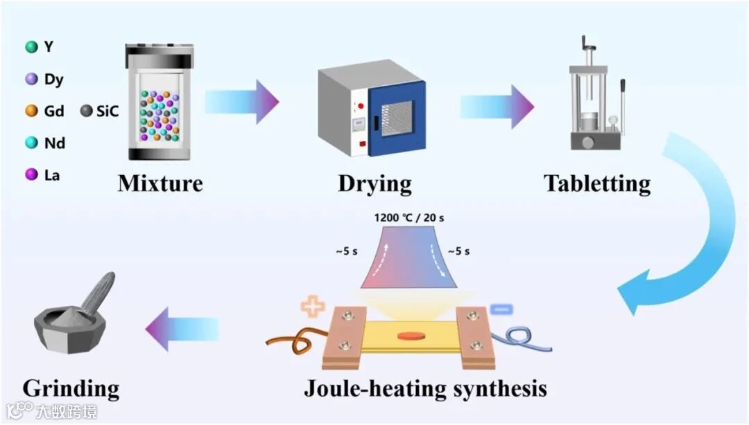 本图清晰地展示了从原料到高性能材料的全链条、高效率制备路径。研究以五种稀土金属(Y, Dy, Gd, Nd, La)与β-SiC为原料,经湿法球磨混合后压片,置于定制的高真空焦耳加热装置中。其核心在于施加20-30 A的直流电,使样品在秒级时间内经历急速升温与烧结。这张示意图突出了该工艺快速、高效、节能的核心特点,为后续实现非平衡态下高熵单相固溶体的形成奠定了技术基础。