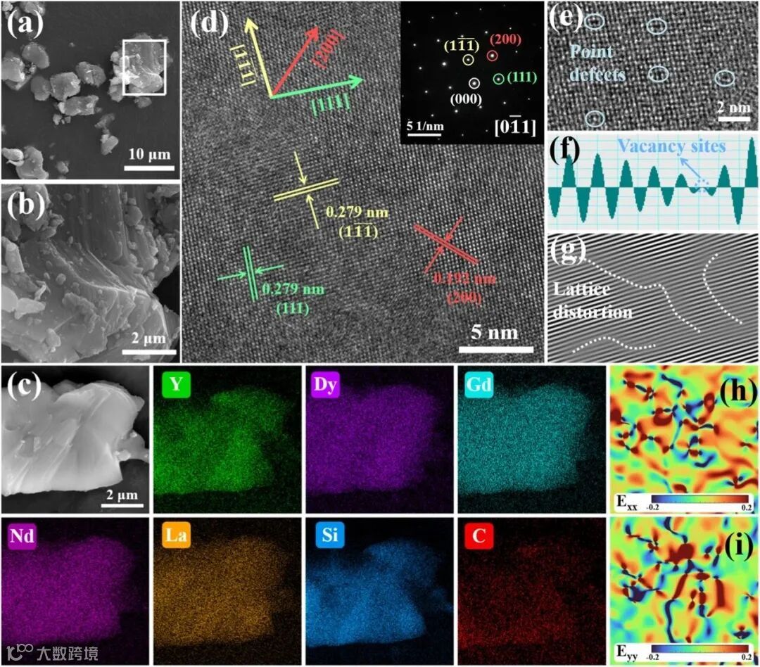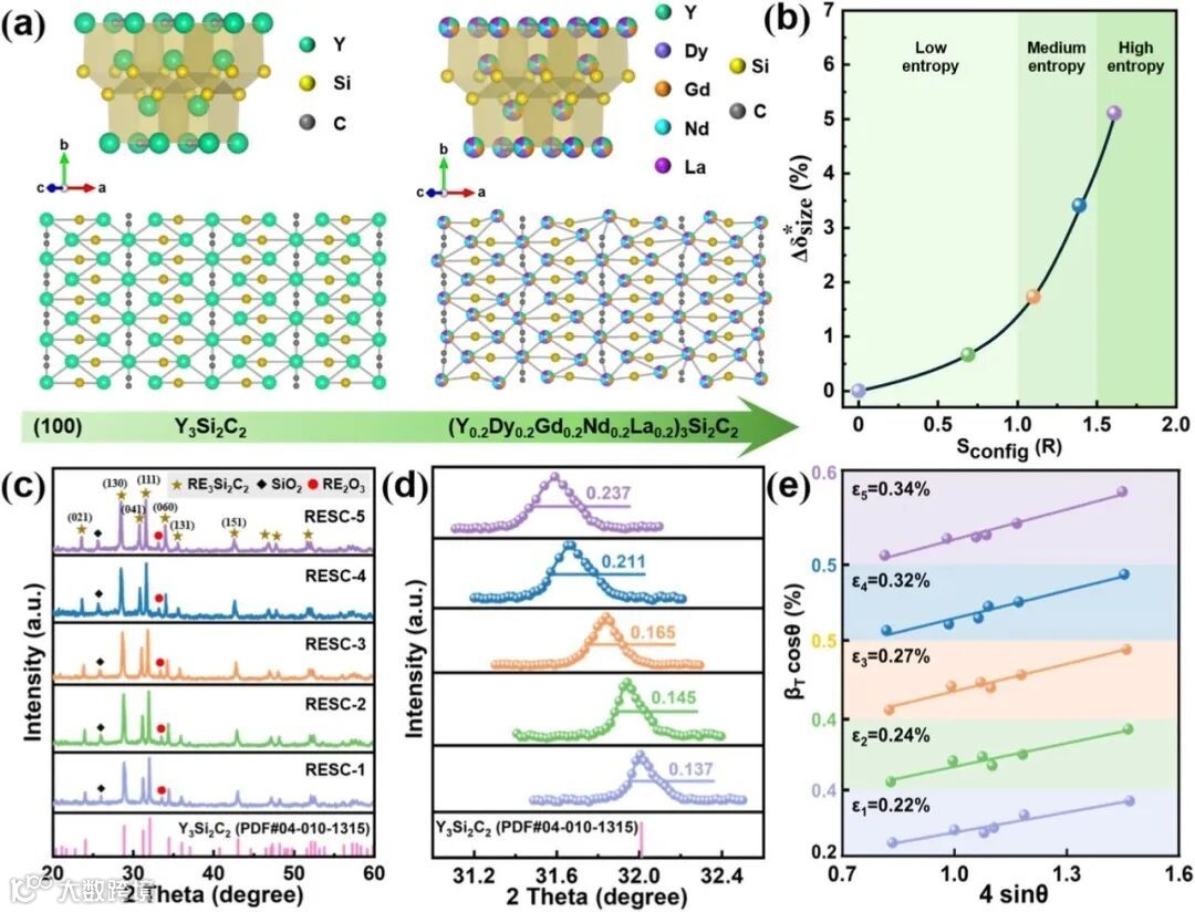 图3 则揭示了研究的核心发现:随着稀土元素种类从1种增至5种,材料的构型熵不断提升,导致XRD衍射峰明显宽化并向低角度移动。通过威廉姆森-霍尔分析定量计算出,微应变从0.22%增至0.34%,直接证明了“高熵”确实引发了显著的晶格畸变,为性能飞跃提供了结构根源。