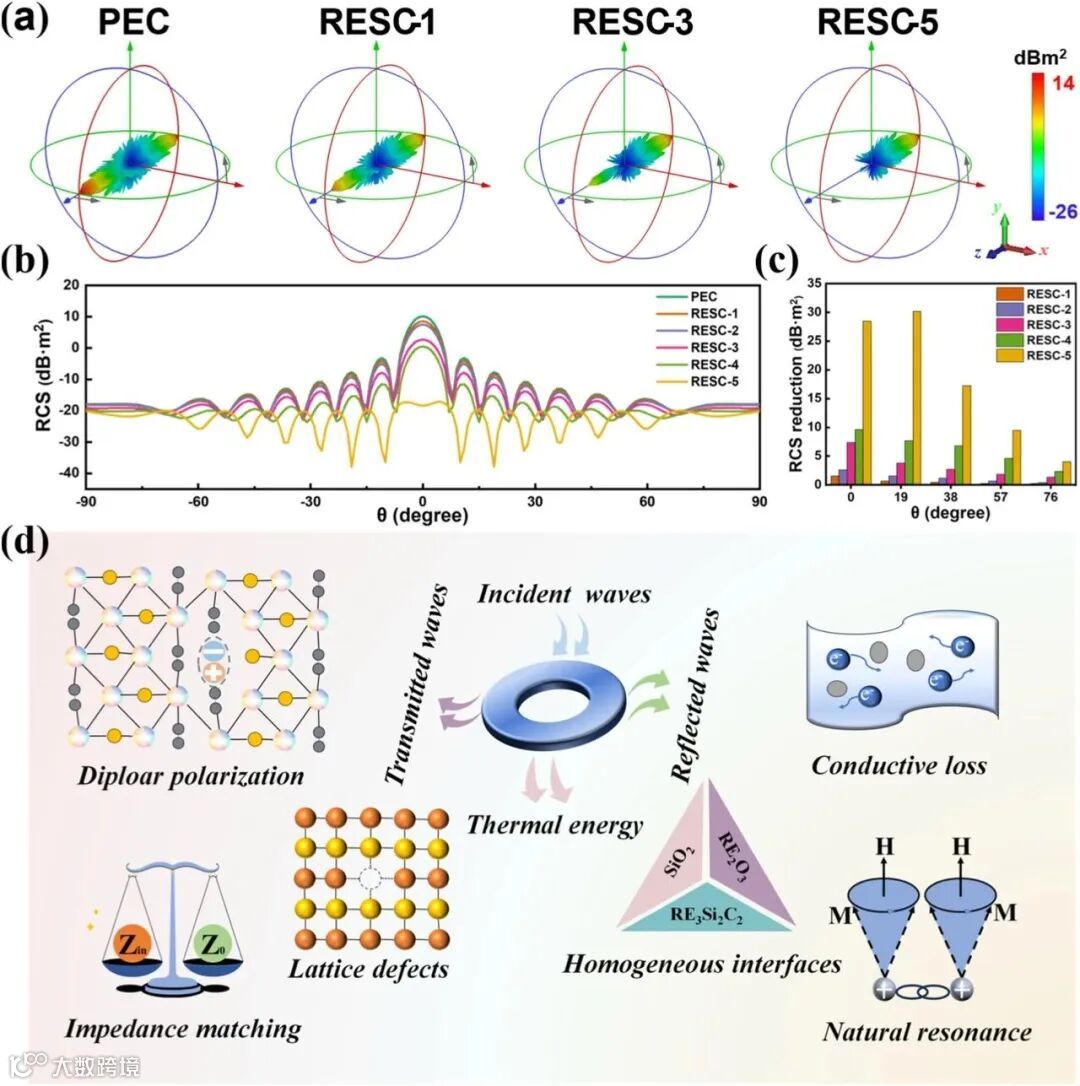 图8 将实验室性能推向实际应用场景。通过CST软件仿真,对比了涂覆不同材料板材的雷达散射截面。结果显示,涂有RESC-5的板材在很宽的角度范围内回波信号最弱,最大RCS减缩值达到30.14 dB·m²,隐身效果显著。图中的机制示意图进行了完美总结:高熵诱导的缺陷/偶极化、异质界面产生的界面极化、纳米层状结构促成的多重反射、以及涡流损耗等机制协同工作,共同构筑了一道高效耗散电磁波能量的“多层次防御网”。