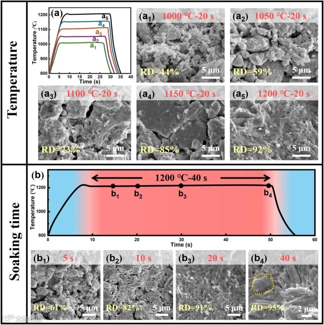 图2 系统研究了烧结参数对微观结构的影响,确立 1200°C、20秒 为最优条件,此时材料致密度高(92%)、晶界清晰,完美平衡了快速致密化与抑制元素偏析。