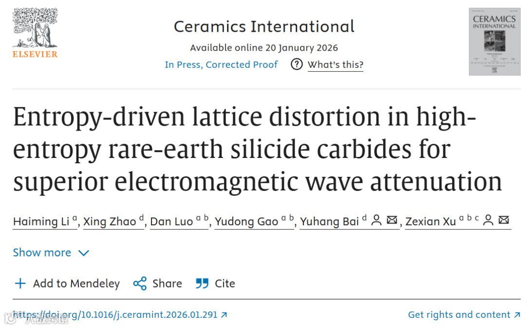 Li, H.; Zhao, X.; Luo, D.; Gao, Y.; Bai, Y.; Xu, Z. Entropy-driven lattice distortion in high-entropy rare-earth silicide carbides for superior electromagnetic wave attenuation. Ceram. Int. 2026, *52*(Part B), 12345-12356. DOI: 10.1016/j.ceramint.2026.01.291.
