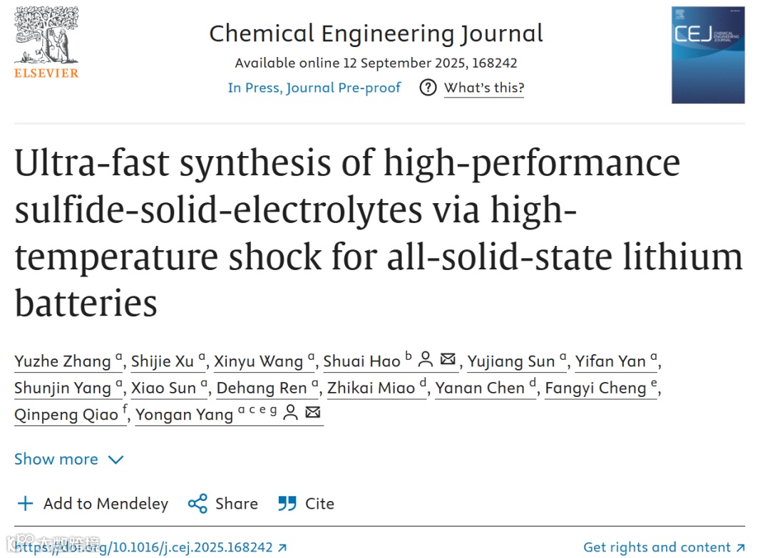 全固态锂电池产业化进程因硫化物电解质合成效率低、成本高而受阻。天津大学杨永安教授团队在Chemical Engineering Journal上发表重要研究成果,采用高温冲击(HTS)技术,仅用33秒成功制备出高性能Li₆PS₅Cl固态电解质,将传统工艺耗时缩短727倍,能耗降低16倍,组装的电池循环寿命超过2200小时,为全固态电池的规模化生产提供了新技术路径。