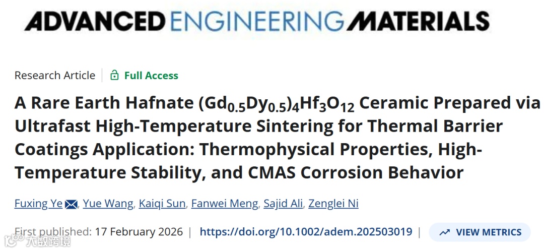 天津大学叶福兴团队最近在《Advanced Energy Materials》上发了一篇,用超快高温烧结(UHS),7分钟就把(Gd₀.₅Dy₀.₅)₄Hf₃O₁₂(以下简称GDH)烧出来了。而且不是“烧出来凑合用”,是热膨胀系数11.8×10⁻⁶/K(1500℃)、热导率1.83 W·m⁻¹·K⁻¹(1300℃)、1500℃退火60小时不分解、晶粒生长速率13.7 nm/h、CMAS腐蚀10小时反应层不到9 μm——这数据摆出来,YSZ确实该紧张了。