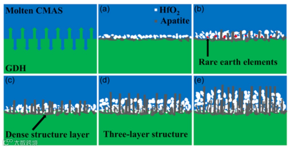 这个过程里有个细节值得注意:Hf⁴⁺在CMAS熔体里溶解度低,加上RE³⁺被磷灰石消耗,Hf⁴⁺只能析出成HfO₂。这正好解释了为什么反应层里HfO₂和磷灰石共存,而不是混成一团。