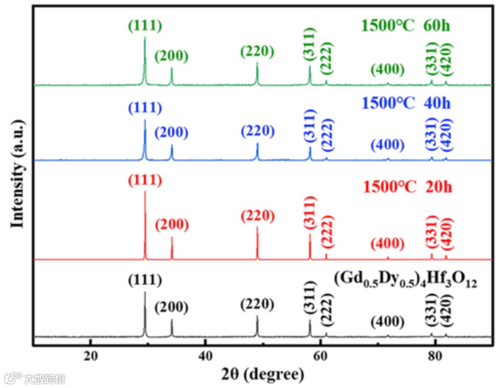 图5是1500℃退火20、40、60小时后的XRD,所有峰位置和烧结态完全重合,没有新相冒出来,没有峰分裂。这说明什么?萤石结构焊死了,Gd和Dy在晶格里待得踏实,60小时高温都没把它们赶出来。