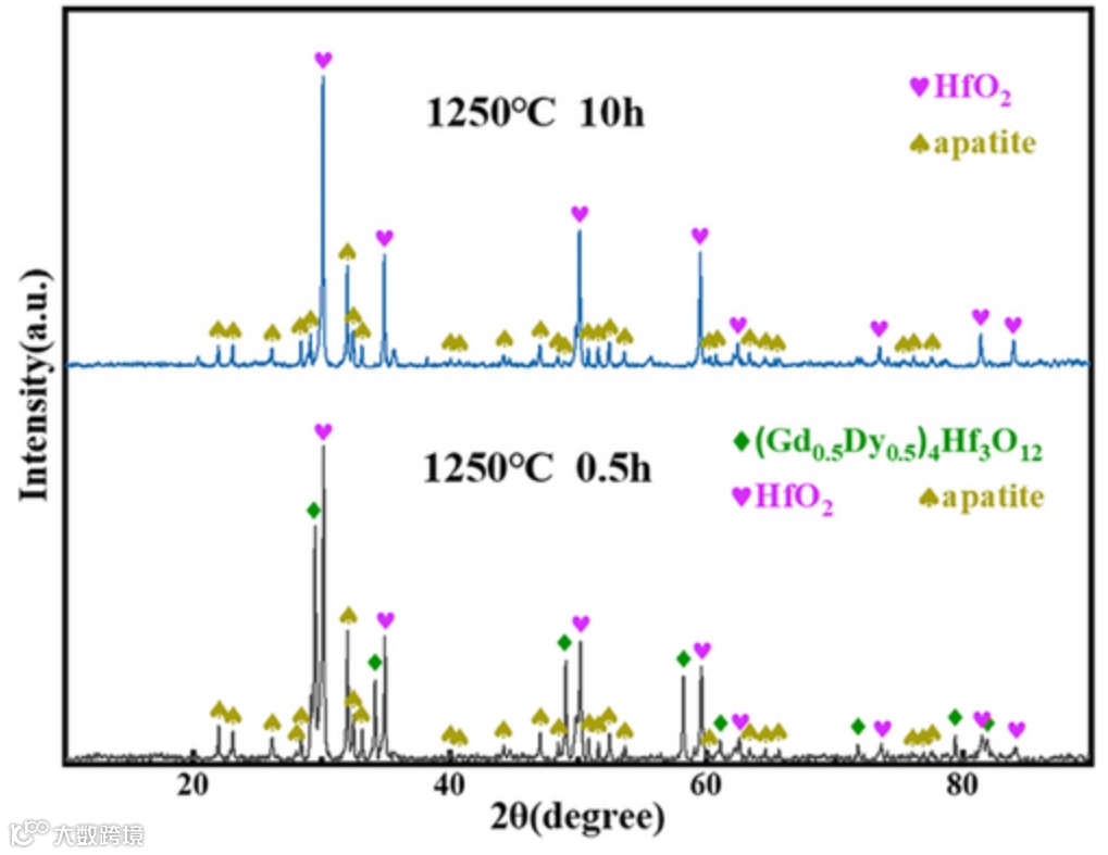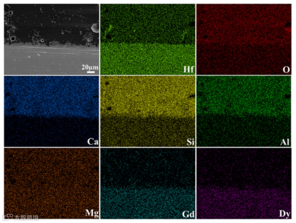 图8的XRD把反应产物交代清楚:萤石结构的HfO₂和磷灰石相Ca₂RE₈(SiO₄)₆O₂。图9的EDS面扫更直观——Ca、Si、Al全被挡在反应层外面,Hf、Gd、Dy老老实实待在基体里,两边井水不犯河水。