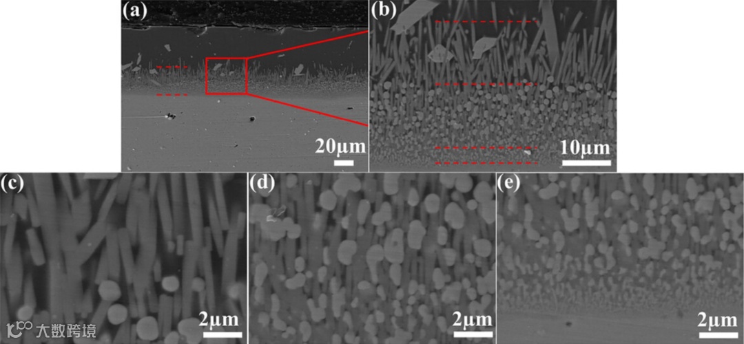 图10是20小时后的截面,已经分出三层结构:顶层稀疏的HfO₂+浮起的磷灰石,中层均匀分布的HfO₂+垂直生长的棒状磷灰石,底层两相致密交替。关键在底层——那是真正挡CMAS的“装甲”,密度高、没孔隙,熔体根本过不去。