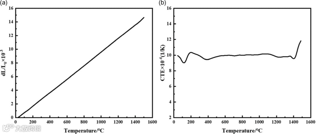 图4的热膨胀曲线,从室温到1500℃基本线性,1500℃时CTE冲到11.8×10⁻⁶/K,和镍基高温合金(14-16×10⁻⁶/K)已经能对上。热循环时的热应力,能压下来。